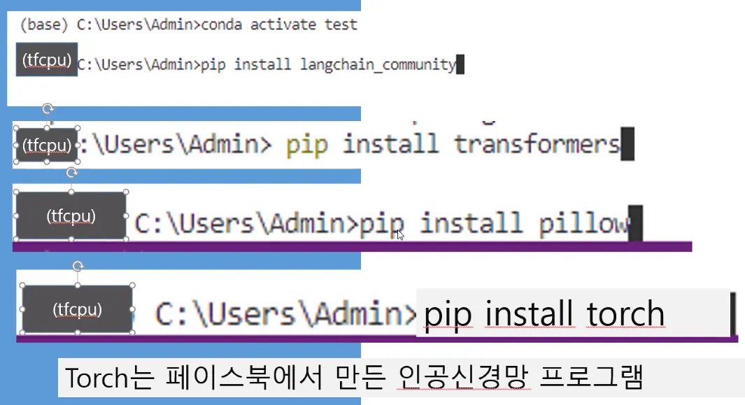 pandas를 설치하는데 판다스를 설치하는 가상환경(tfcpu)을 불러와서 설치해야한다.